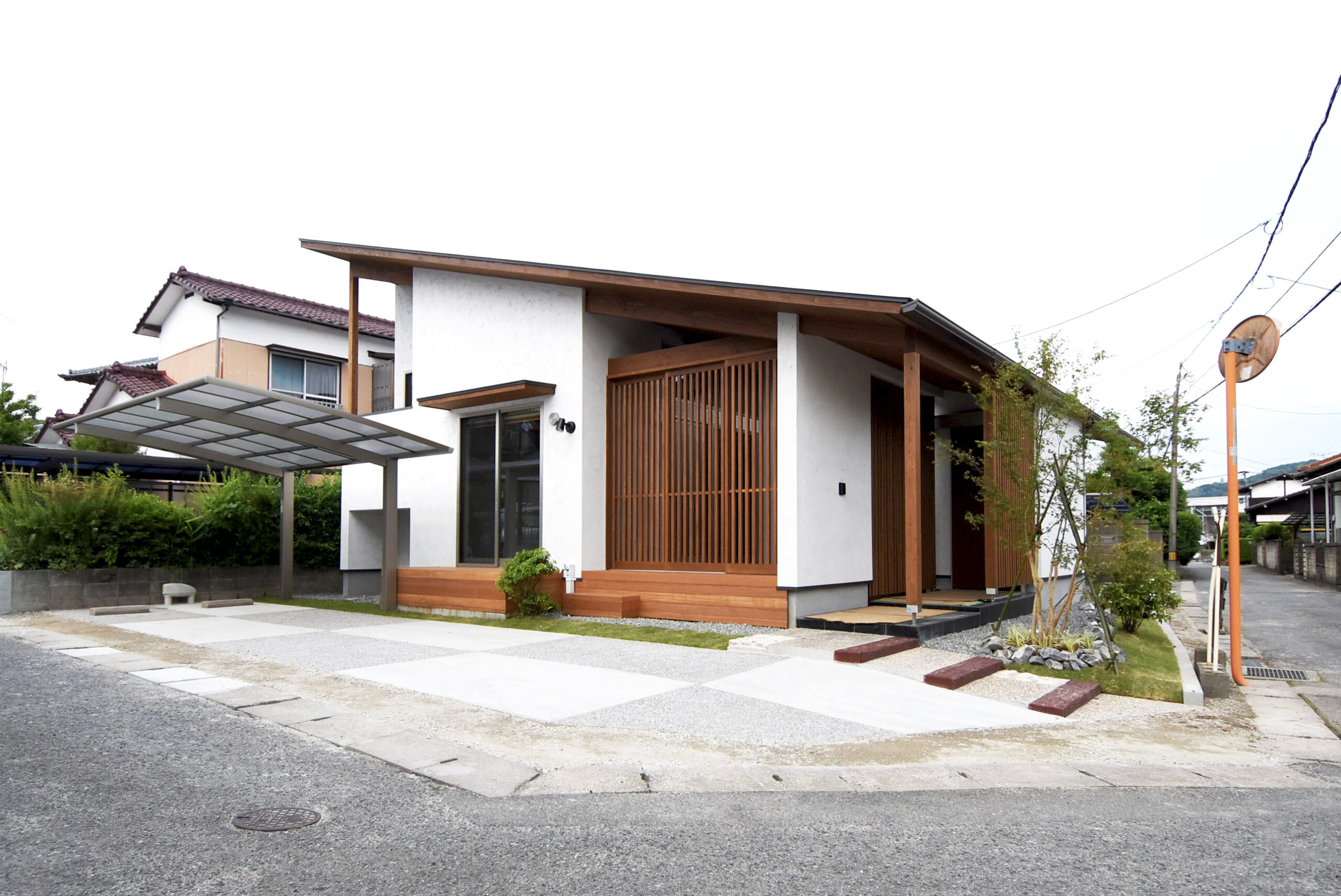 金鏝仕上げのみで仕上げると、住宅の外壁が白いため外構も白にしてしまうと全体が単調の印象で仕上がってしまいます。そこに玉砂利洗い出し仕上げのグレーを取り入れることで、和風の外観に調和する柔らかい雰囲気に仕上げました。
