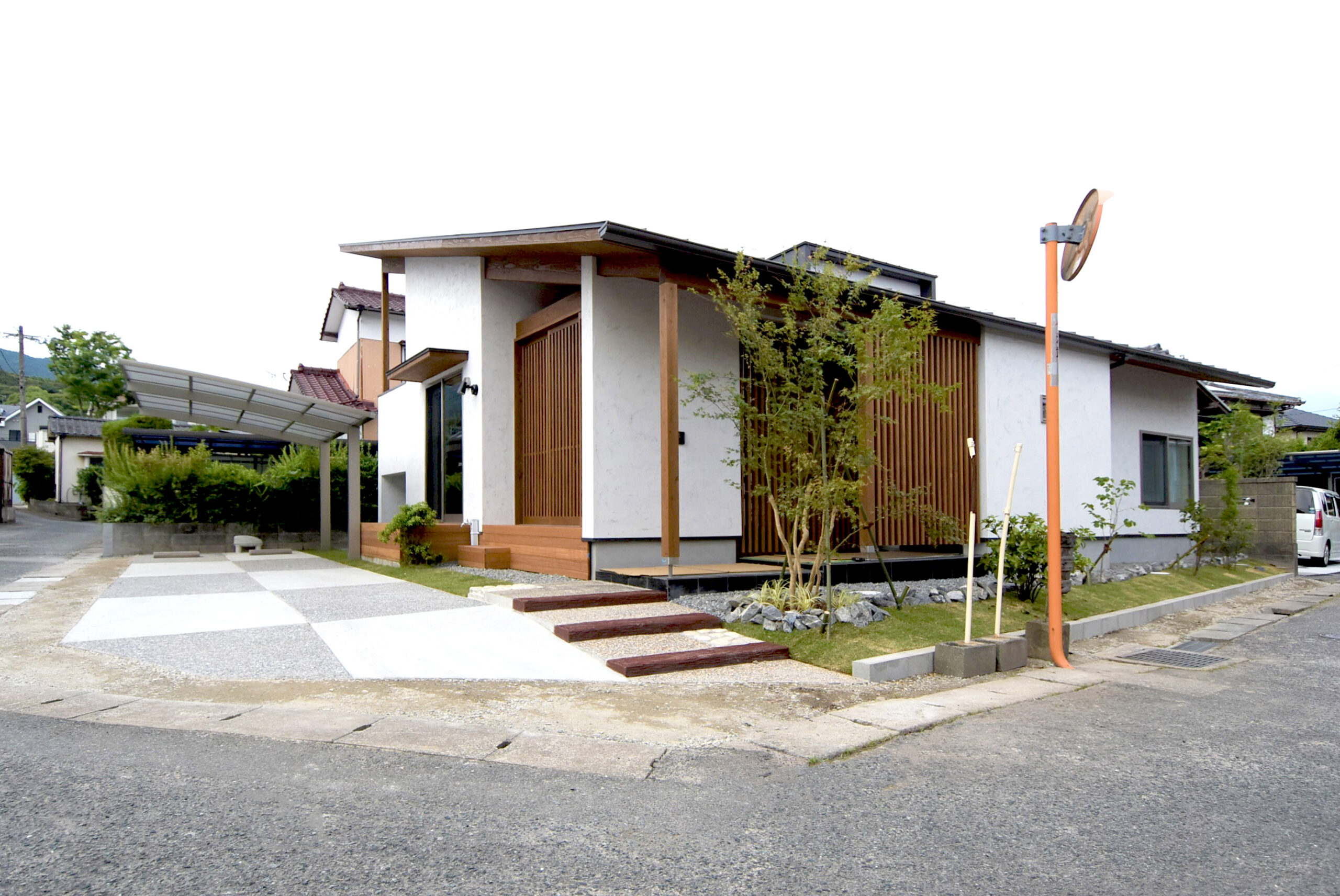 アプローチの傾斜を階段にすることで、駐車場とアプローチ部分の境界を明確にしました。