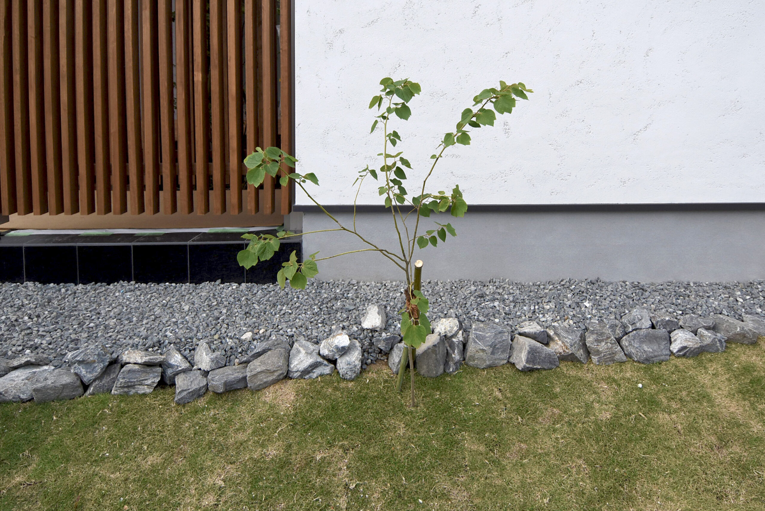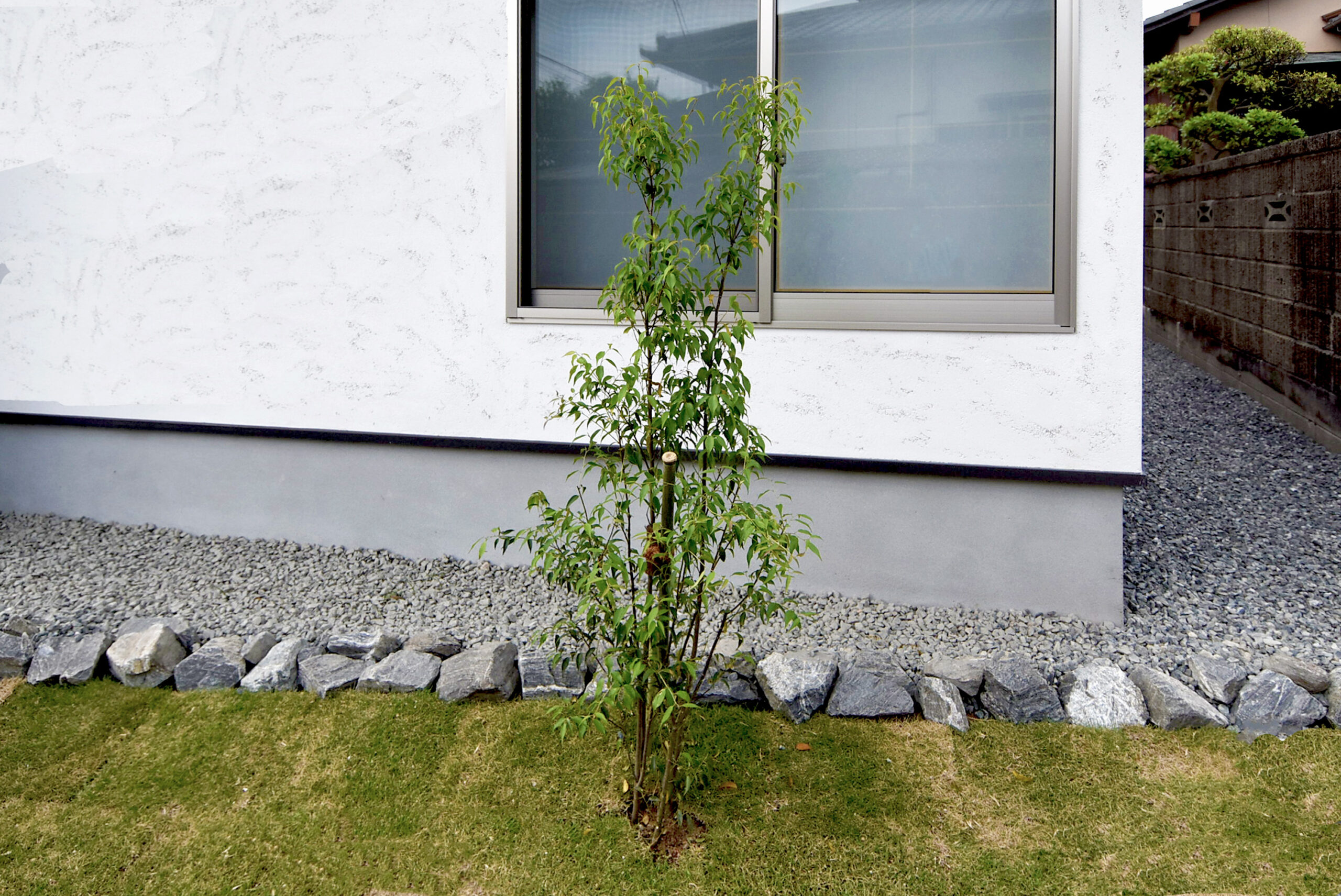 また、窓の前にはシラカシを配置。今後の成長を見据えて、目隠しとしての役割も兼ねています。